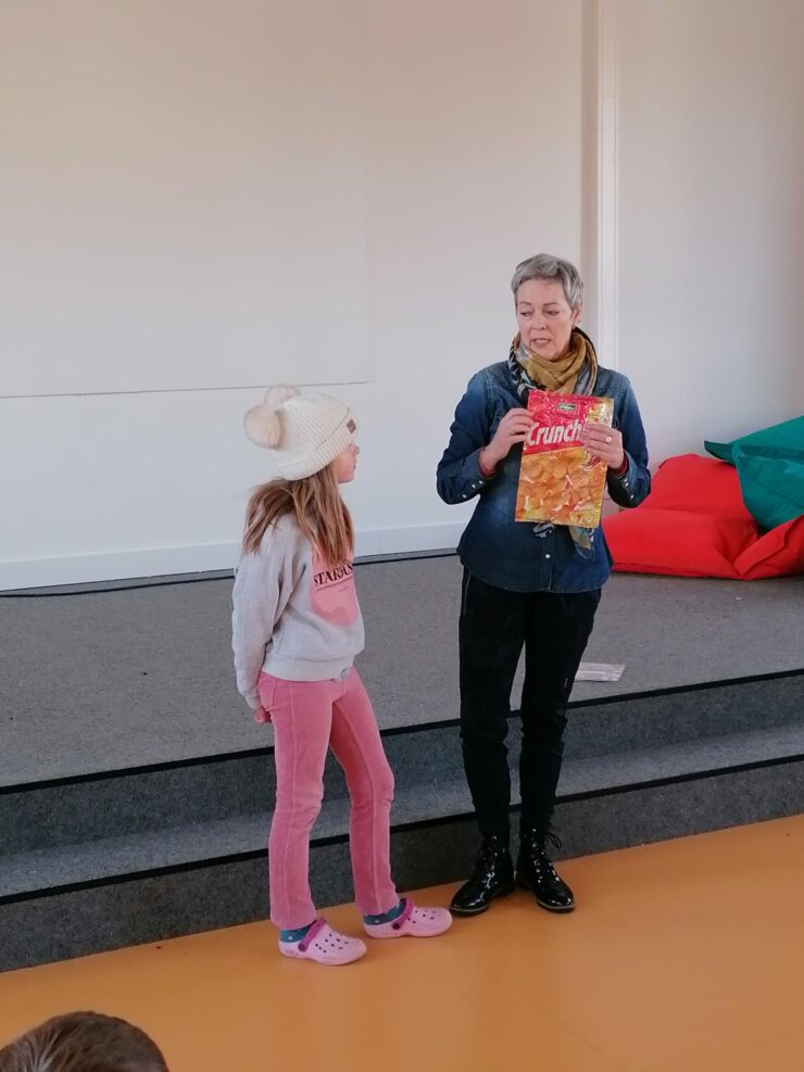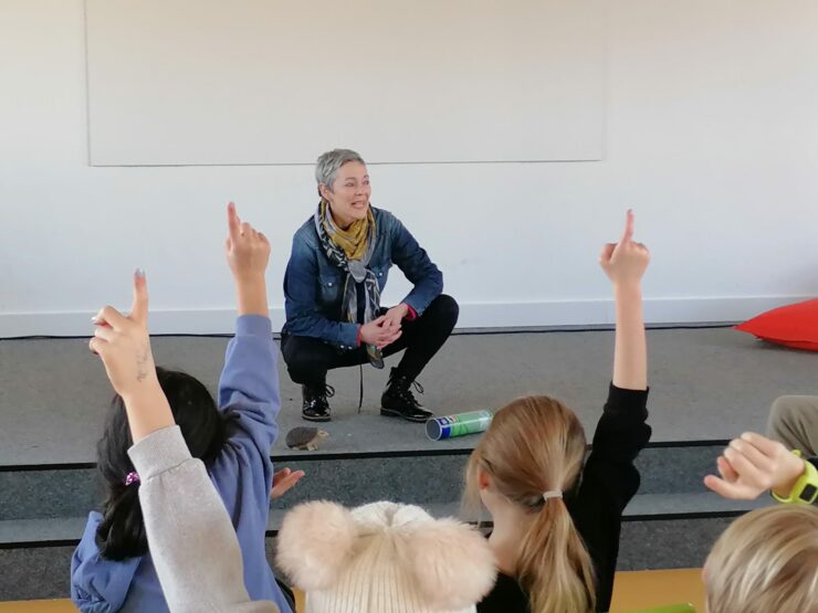 Nachdem Birgit Schad ein großes, selbst gestaltetes Bild aus Müll – den sie in nur einer Woche am Strand gesammelt hatte – präsentierte, folgten die Klimaschützer*innen gespannt ihren Ausführungen. Am Strand, so erzählte sie, findet man leider nicht nur Muscheln, Seesterne und Sand, sondern auch jede Menge Müll. Vor allem Plastikmüll und Luftballons sind ein großes Problem für unsere Natur. Dass sich Tiere daran verletzen und sogar sterben können, machte Frau Schad mit einem Bilderbuch deutlich. Noch eindrucksvoller waren für die Klimaschützer*innen allerdings Fotos von verletzten Tieren, die sogar in der Nähe gemacht wurden. Das Bild eines Igels, der in einer Chipsdose verendet ist, führte zu großer Betroffenheit bei den Kindern.