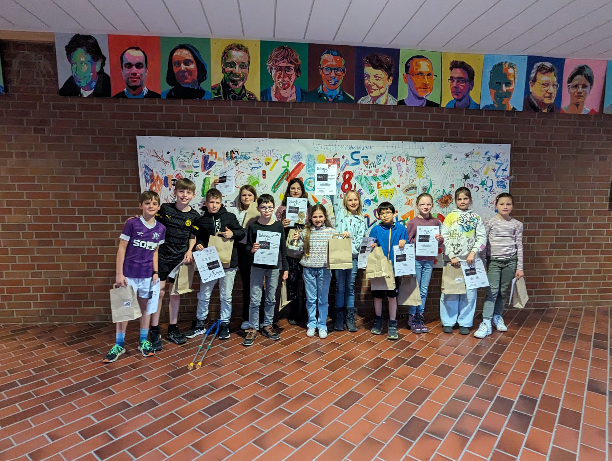 Insgesamt ca. 50 Kinder von neun Grundschulen aus der Nachbarschaft nahmen teil. Von jeder Schule wurden die fünf Kinder mit den meisten Punkten gewertet und daraus wurde ein Punkteschnitt errechnet. Knapp wie nie zuvor setzten sich die Kinder der HGS gegen den Vorjahressieger der Schule in der Dodesheide durch. Von 42 zu erreichenden Punkten hatten sie einen richtig tollen Schnitt von 32,7 gegenüber der Nachbarschule mit 32,6 Punkten. Knapper ging es also nicht!