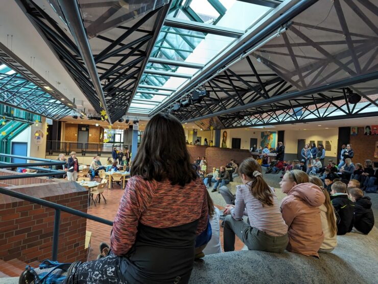 Die Veranstalter schafften es, dass alle Kinder mit einem richtig guten Gefühl nach Hause gingen. Die Aufsicht bei der Bearbeitung der Aufgaben (90 Minuten) wurde von den Schülern und Schülerinnen eines Mathekurses des 10. Jahrgangs (geschätzt) übernommen. Besonders schön war, dass auch eine ehemalige Schülerin der HGS und gleichzeitig Schwester einer unserer Viertklässler dabei war. Anschließend konnten die Kinder entweder an einer Sport- oder eine Kunststunde teilnehmen. Das Ergebnis der Kunststunde kann man im Hintergrund der Gruppenfotos sehen. Für die wartenden Eltern und Lehrkräfte gab es ein Cafe, welches wiederum von Kellnerinnen und Kellnern des 6. Jahrgangs organisiert wurde. Auch hier waren einige Ex-Heilig-Geister dabei.