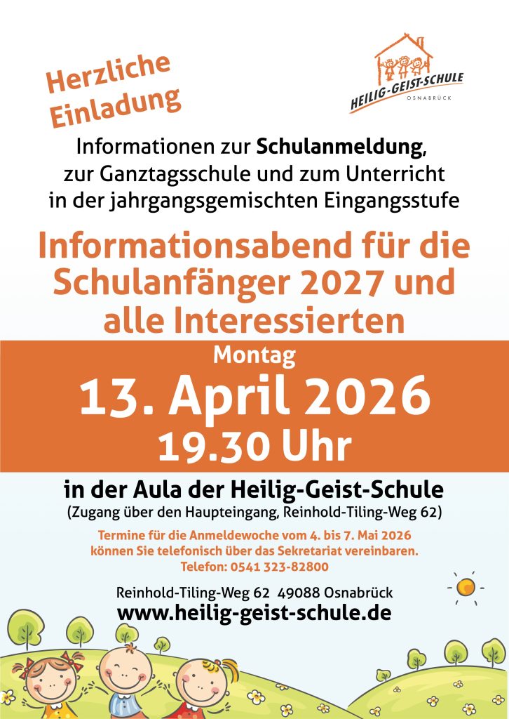 Am Montag, 13. April 2026 gibt es die Gelegenheit sich um 19.30 Uhr in der Aula unserer Schule über die Arbeit in der Eingangsstufe und das Ganztagsangebot unserer Schule zu informieren.