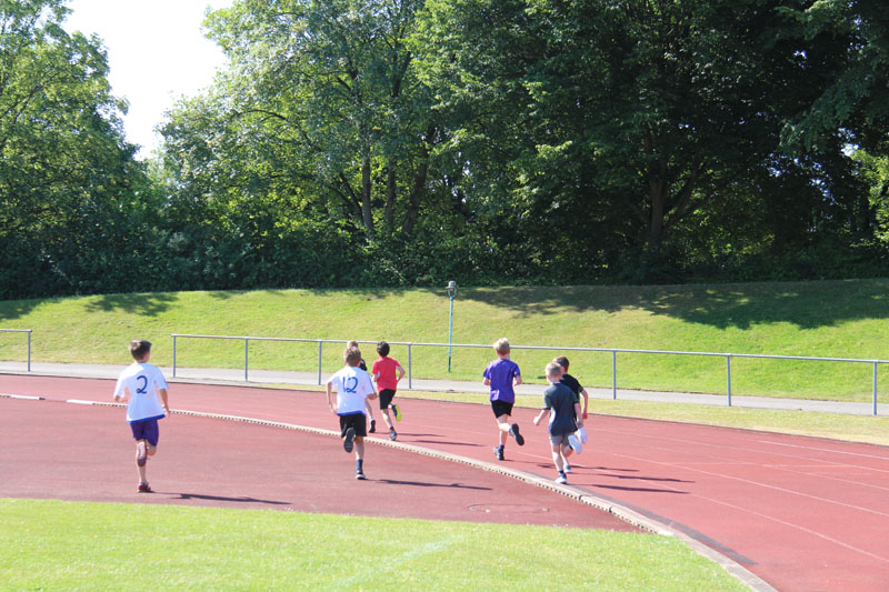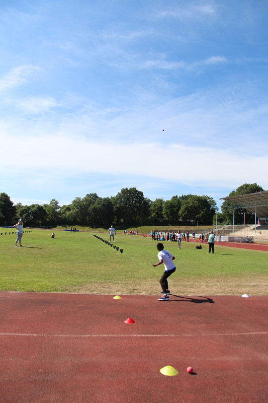 Der Tag startete allerdings mit einer anderen Disziplin und zwar der anstrengendsten: die 3 x 400-Meter-Staffeln der Mädchen und die der Jungen. Die Jungen landeten mit einer richtig guten Zeit von 3:52 min. auf dem 3. Platz, nachdem sie ihren Lauf gegen zwei andere Schulen gewonnen hatten. Die Mädchen kamen in ihrem Lauf mit 4:13 min. als Zweite ins Ziel, was ebenfalls den 3. Platz bedeutete. Kurioserweise fehlten beiden Staffeln nur jeweils fünf Sekunden bis zu den erstplatzierten Schulen. Die Sieger-Zeit der Heilig-Geist-Staffel der Mädchen von 2018 lautet übrigens 4:04 min.