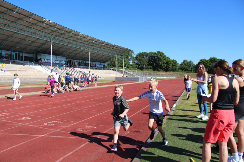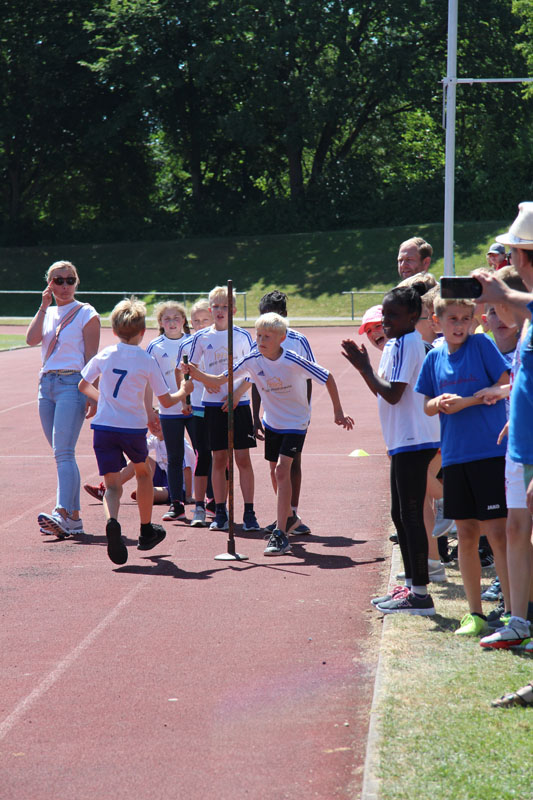 Zum Abschluss des Tages ging die 8 x 40-Meter-Pendelstaffel (4 Jungen und 4 Mädchen) an den Start. Hier gewannen unsere Sprinter ihren eigenen Lauf ganz knapp vor der Grundschule in der Wüste. Nach den drei Läufen verkündete der Turnier-Leiter (zum 1. Mal Herr Watermann), dass es 4 Schulen mit 1:58 min. gebe und deswegen ein Finale mit diesen vier Staffeln stattfindet. Das gab es vorher noch nie. Die Kinder freuten sich, waren aber auch etwas verwirrt, weil die Wüste-Schule ja eigentlich besiegt wurde. Sie hatten aber ebenfalls eine Zeit mit 1:58 min. So kam es zum großen Showdown, bei dem unserer Schule allerdings etwas spät aus den Startlöchern kam und den Rückstand nicht mehr richtig aufholen konnte. Zur Wahrheit gehört aber auch, dass es bei den anderen Schulen ein wenig nach einem kleinen Fehlstart aussah. 😊Erstaunlich war bei den Final-Staffelläufen die hohe Qualität, die sich darin zeigte, dass keine der Schulen auf der engen Laufbahn den Staffelstab verloren hat.