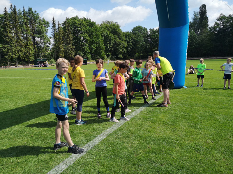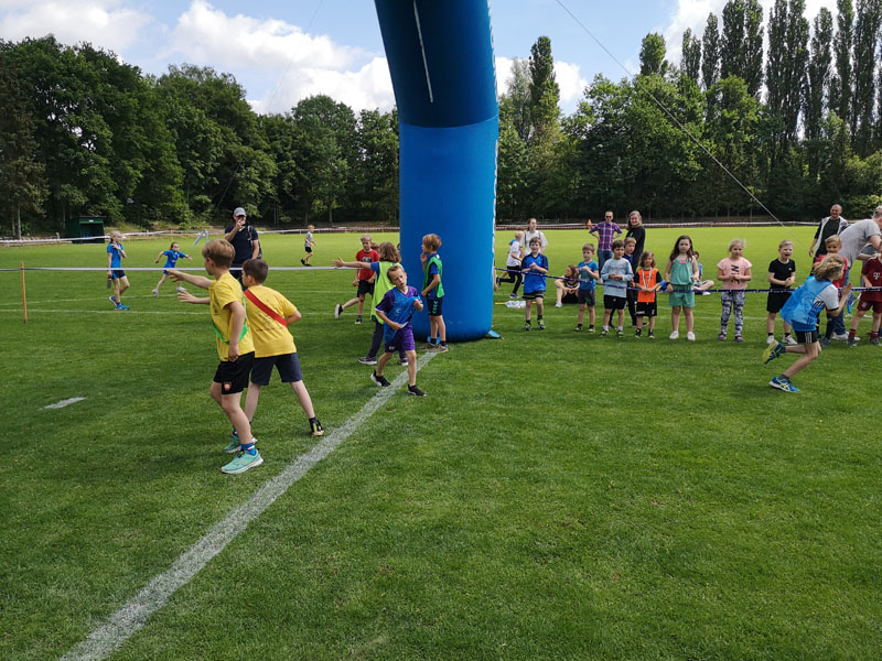 Außer uns war nur noch die Grundschule Haste am Start. Von der 1. Bis 4. Klasse wurden 4 mal 400-Meter-Staffeln rund um den Fußballplatz gelaufen. Jede Schule trat in allen Klassen mit mehreren Staffeln an und so mussten die Kinder also nicht nur gegen die anderen Schulen, sondern auch gegen Teams der eigenen Schule laufen. Durchschnittlich liefen pro Jahrgang sieben Staffel-Teams gegeneinander, dementsprechend wenig Platz war auf der Laufbahn.